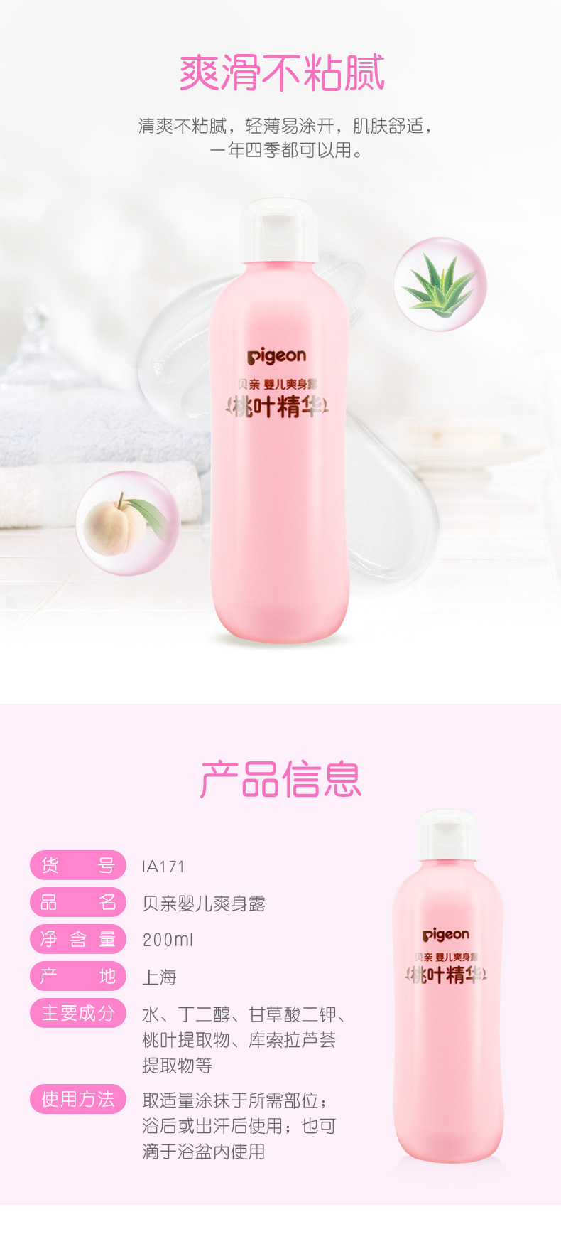 贝亲(Pigeon) 桃子水 桃叶水 液体爽身粉 婴儿爽身露 四季通用 200ml IA171
